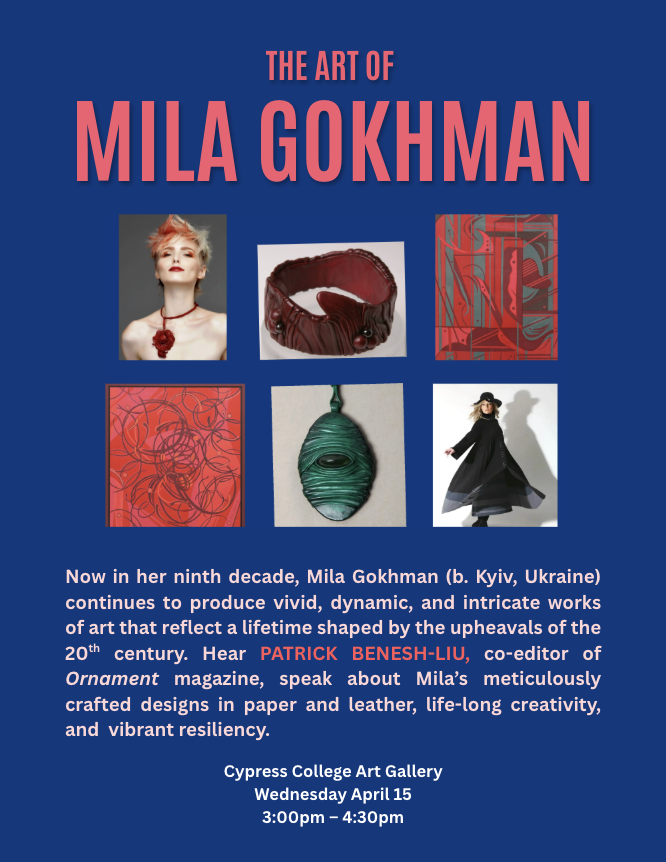 Now in her ninth decade, Mila Gokhman (b. Kyiv, Ukraine) continues to produce vivid, dynamic, and intricate works of art that reflect a lifetime shaped by the upheavals of the 20th century. Hear PATRICK BENESH-LIU, co-editor of Ornament magazine, speak about Mila's meticulously crafted designs in paper and leather, life-long creativity, and vibrant resiliency.
