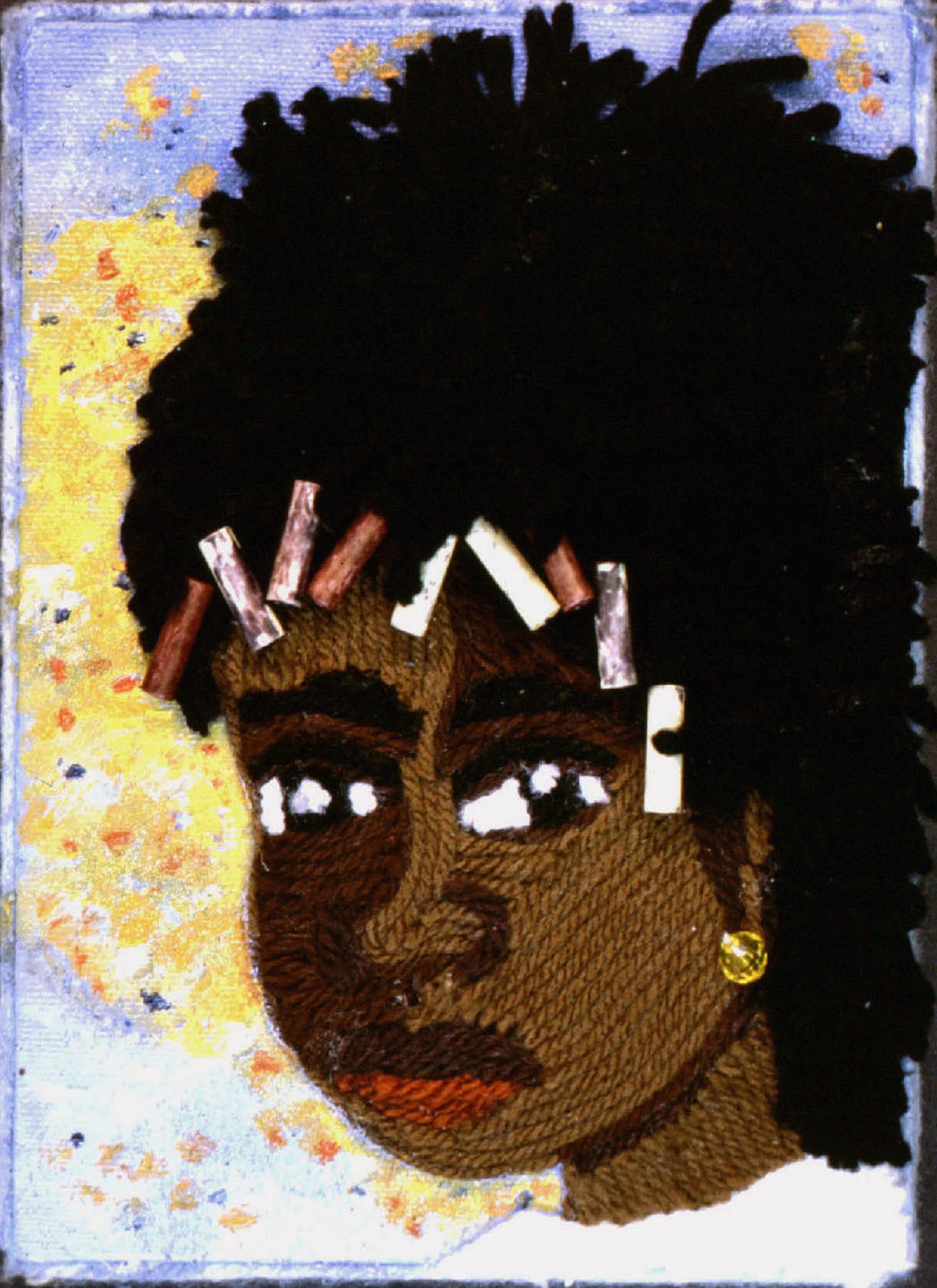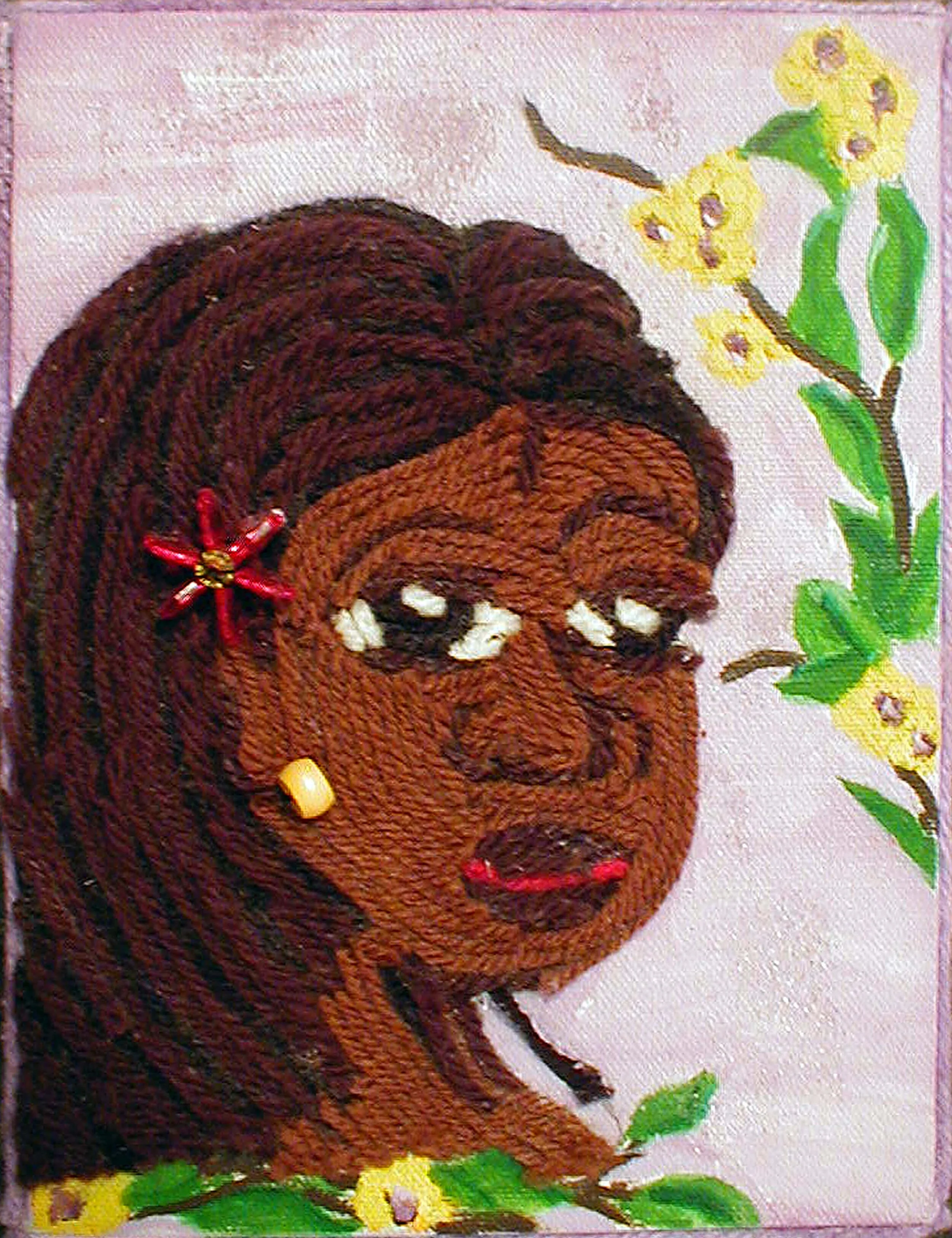 Nzuji De Magalhães was born and raised in Angola. Her work combines Angolan artistic styles with the western skills of illusionistic drawing and painting that she learned as a college student in the United States. Entwining two essential perspectives of her diverse cultural background, De Magalhães uses fabrics, sand, beads, glitter, and yarn above oil-painted backgrounds to communicate the many interpretations foreseen in Angolan traditional and contemporary culture, and convey issues of stereotypes, ethnicity, and politics.