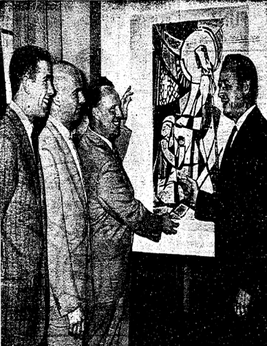 March 1959: TVS exhibits paintings, drawings, mosaics, and sculpture at the L.A. County Art Institute, including pen and wash drawings from Europe and the Middle East. Guests include his family, Millard Sheets, Maj. Gen. Kenneth P. McNaughton USAF ret., and “Mrs. Howard Ahmanson, wearing a striking hat of black silk with its own tiara, served coffee from a brass urn.”[v]